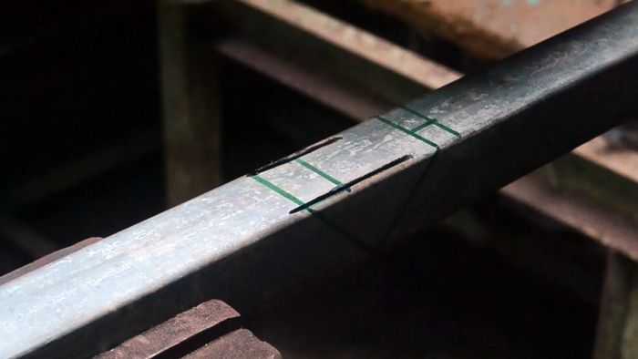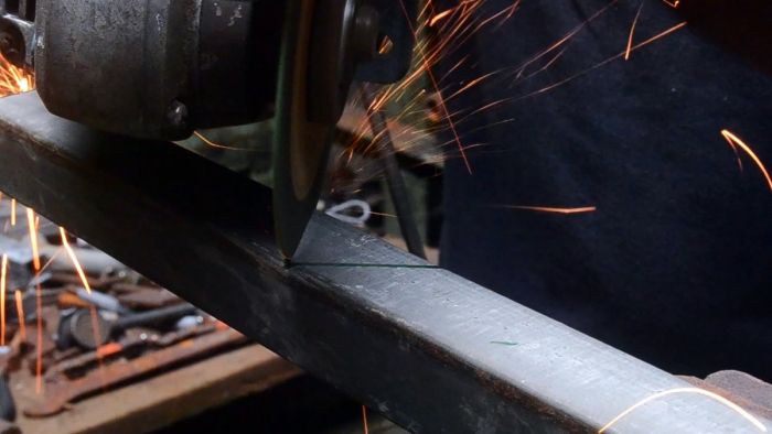 Болгаркой с тонким отрезным кругом делаются разрезы по контурам боковых углов. На внутренней стороне изгиба нужно разрезать 2 правые параллели и продольную линию между ними. На левых параллелях рез выполняет только на внутренней поперечной черте и продольным меткам возле ребер.