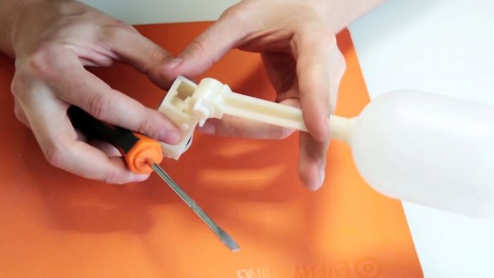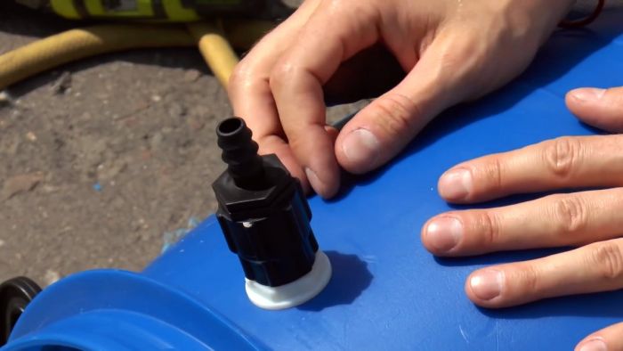 В него изнутри бочки вставляется клапан и поджимается штатной гайкой. Если его трубка пластиковая, то сжимать необходимо умеренно.