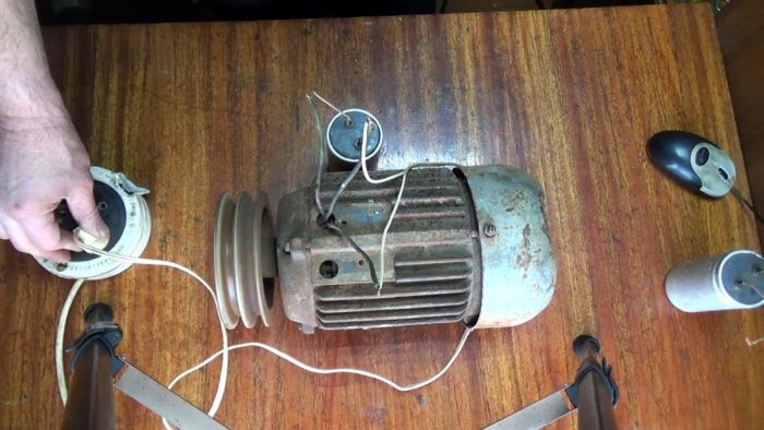 При подключении трехфазного электромотора к сети 220В необходимо обеспечить смещение фазы, чтобы он начал вращаться. Это можно сделать, подсоединив пусковой конденсатор или обычную лампочку накаливания.