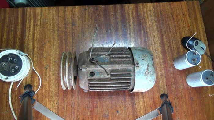 Трехфазный электродвигатель имеет 3 обмотки, поэтому из него выходит 6 проводов по 2 на каждую. Из них 3 имеют один цвет изоляции, остальные 3 другой. Нужно смотать вместе любой пучок с одним цветом изоляции и заизолировать скрутку. Далее к любым двум из оставшихся 3-х проводов подключается двухжильный провод с вилкой.