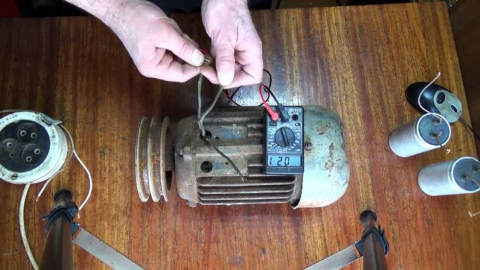 Нужно подключить к оставшемуся проводу контакт конденсатора. Его второй контакт присоединяется к любой из двух скруток. После этого двигатель будет запускаться. В зависимости от того, подключен второй конец конденсатора к фазе или нулю, ротор будет вращаться за или против часовой стрелки. Обязательно при использовании конденсатора перед ним устанавливается пусковая кнопка, так как он должен срабатывать только в момент запуска.