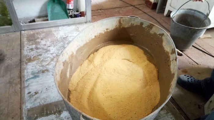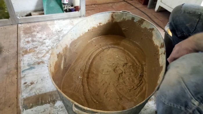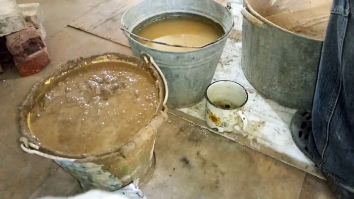 Для начала в емкости замешивается затворенная глина с песком в пропорции 1:2.