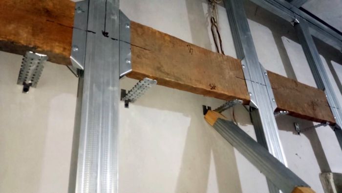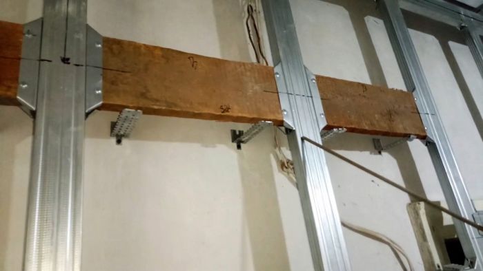 В результате такая закладная выдержит вес более чем в 100 кг. Кроме этого прикрутиться к ней можно в любом месте по горизонтали, даже напротив CD профиль. Однако важно чтобы сами стойки не согнулись и не болтались, поэтому между ними нужно ставить побольше перекладин.