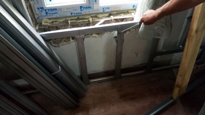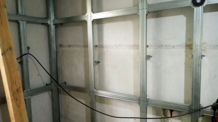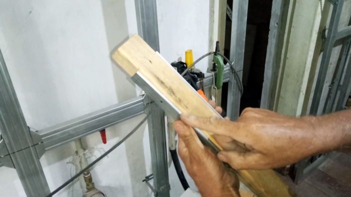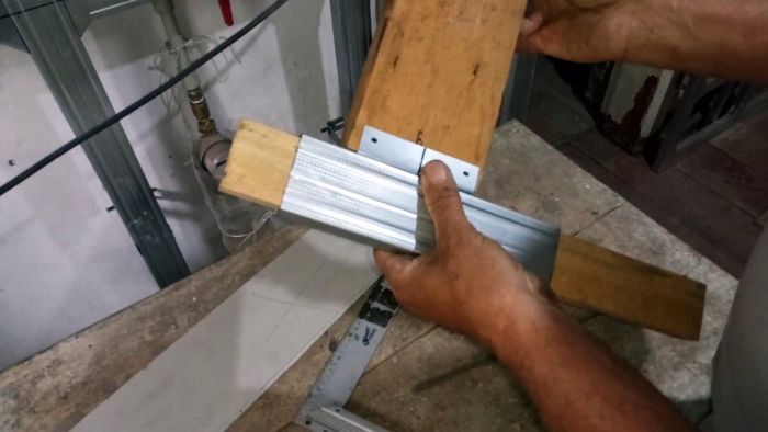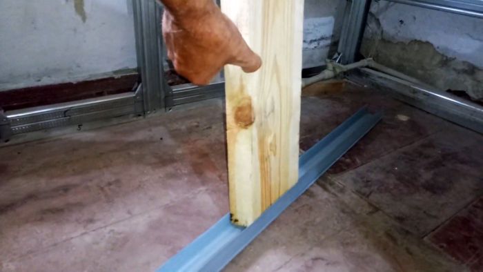 Далее заготавливаются обрезки UD профиля по ширине закладной. Они прикручиваются по бокам к стойкам. Затем между ними распирается закладная. Ее необходимо закрепить саморезами к UD профилю.