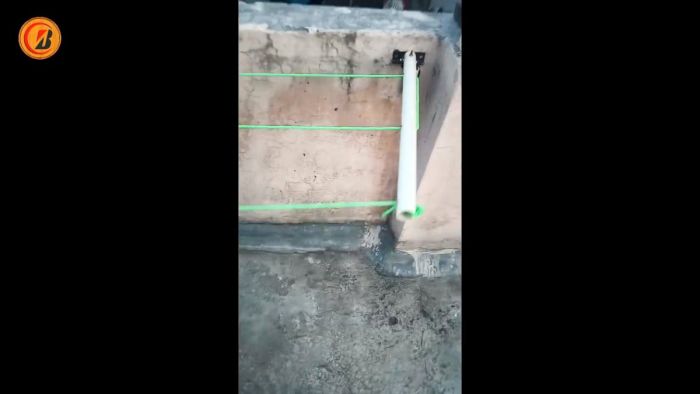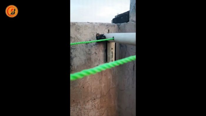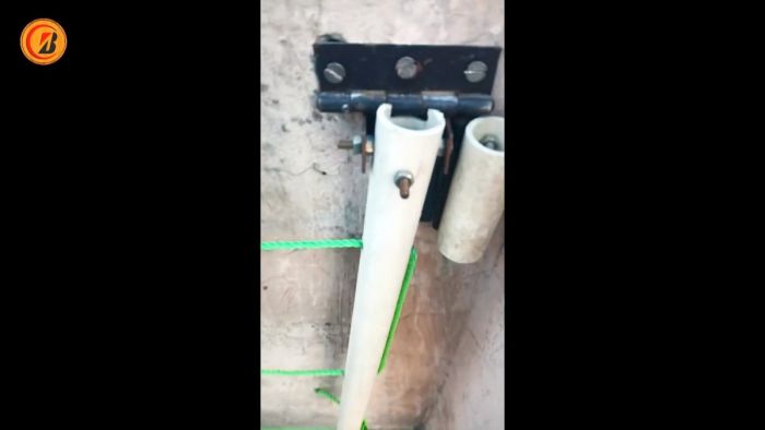Сбоку под ними устанавливаются короткие трубки с петлями. Они располагаются так, чтобы при открывании половины с трубами выполняли функцию подпоров для сушилки. Затем на длинные трубки натягивается бельевая веревка.