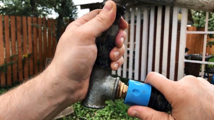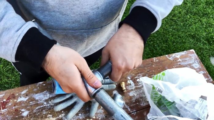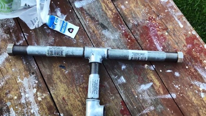 Также изготавливается Т-образная ручка. Она представляет собой тройник с вкрученными сгонами. Из них 2 закрываются заглушками. На нижний сгон устанавливается еще один тройник. На его боковой выход ставится быстросъемный соединитель под садовый шланг.