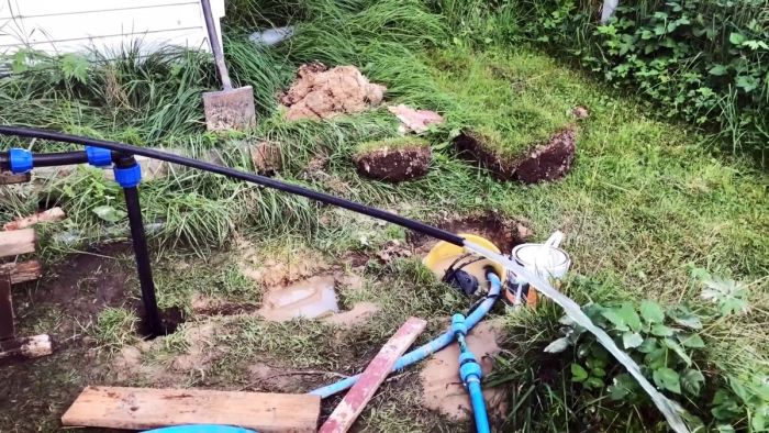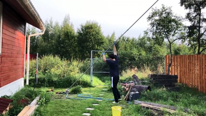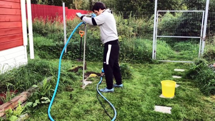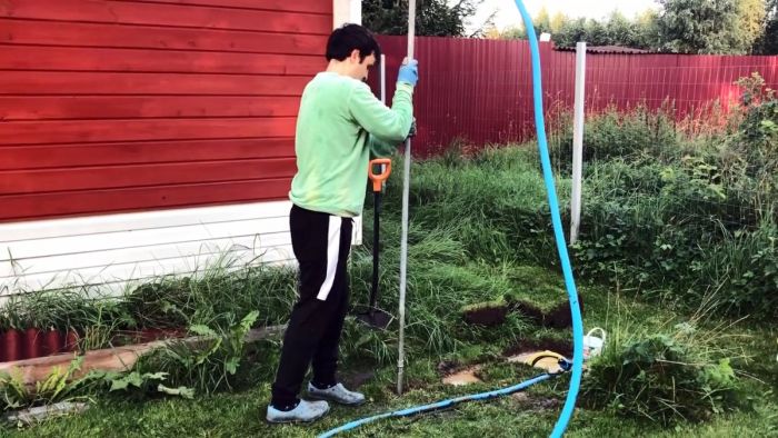 Обеспечить участок водой можно за счет абиссинской скважины пробитой своими руками. Если напороться на богатую водоносную жилу, то воды хватит на полив, наполнение бассейна и любые другие цели. Для бурения скважины не нужно закупать супердорогое оборудование и тратить недели на работу. Если повезет, то начав утром, воду можно получить уже к вечеру.