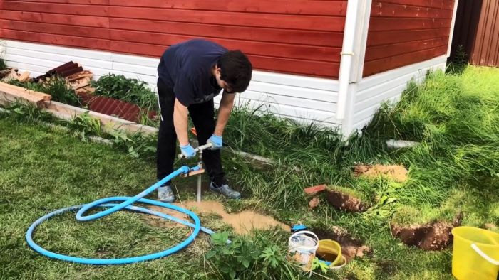 Бурение продолжает до тех пор, пока пика не упрется в водоносную жилу. Это можно почувствовать. В один момент штанга начнет погружаться практически без сопротивления. Кроме этого из приямков начнет резко уходить вода. Подземное русло ее будет быстро затягивать.