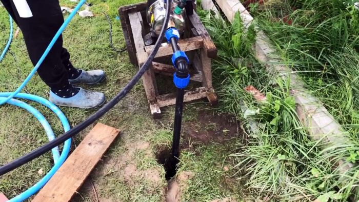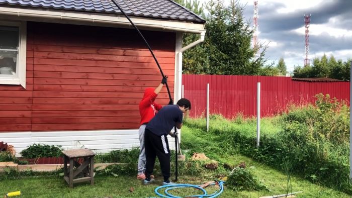 Все делается как можно быстрее, потому что оставленный надолго гидробур может засыпаться песком, и его будет проблематично вытащить. На конце трубы монтируется насосная станция, и делается откачка мути до появления чистой прозрачной воды.