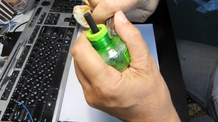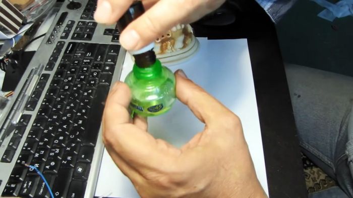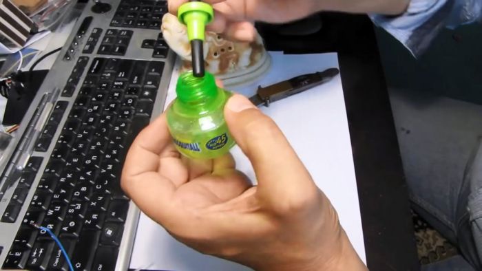 Необходимо открыть пустой пузырек от жидкости для фумигатора и промыть его.