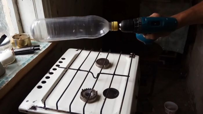 После этого вращающаяся в шуруповерте бутылка прогревается монтажным феном или над газовой плитой со снятым из конфорки рассекателем.
