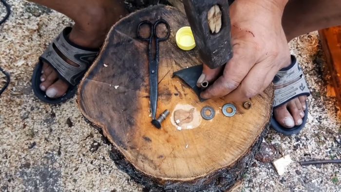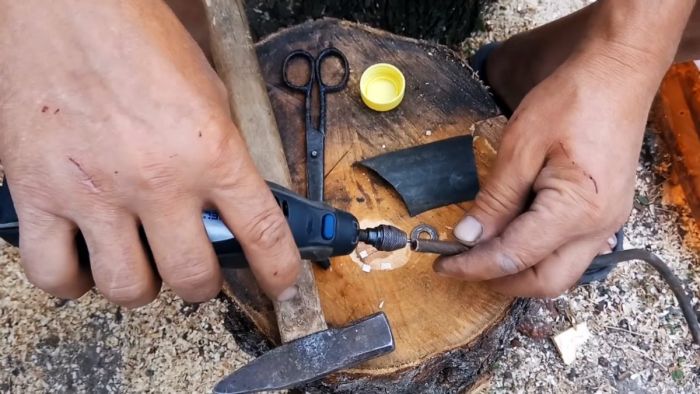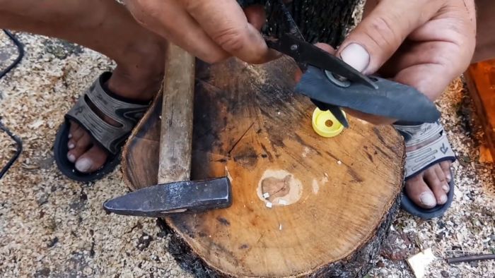 Пробойником требуется пробить 2 отверстия в отрезке велосипедной камеры на расстоянии минимум 5-6 см друг от друга, и одно в центре крышки от бутылки.