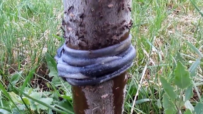 Пропитанная маслом лента обвязывается на стволе дерева. Муравьи, дойдя до такой преграды, не смогут учуять запах тропы, поэтому не пройдут дальше. Для большей надежности можно сделать пару таких лент с небольшим отступом, чтобы полностью их дезориентировать. По мере пересыхания масла и выветривания запаха его нужно доливать на ленту через ложечку или шприц. Таким образом, и муравьи останутся целыми и дерево, а тля без их помощи не сможет так сильно распространяться по кроне.