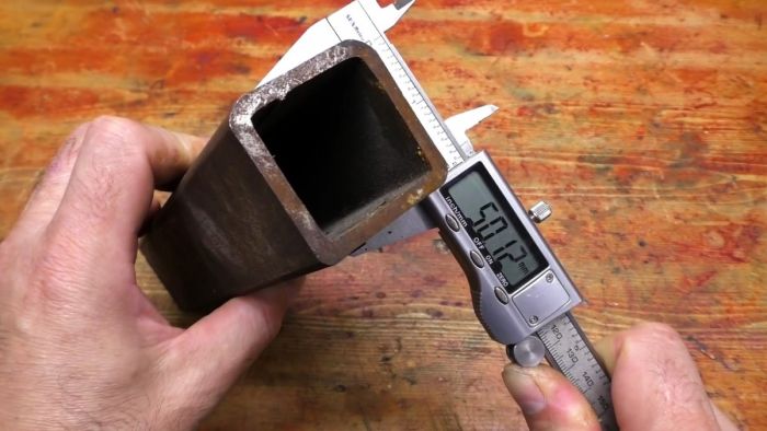 Чтобы подцепить столб домкратом, необходимо сварить П-образную скобу из профильной трубы. Для этого измеряется ширина столба в самом широком месте. В примере она составила 160 мм. Отталкиваясь от этой цифры и накинув 10 мм про запас, нужно отрезать кусок профильной трубы 50х50 мм длиной 170 мм. Она послужит упором под домкрат.