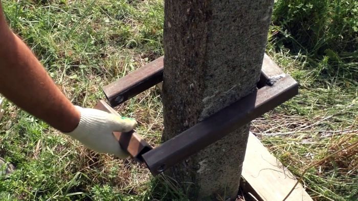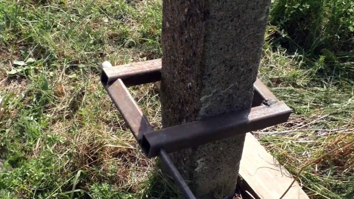 Приспособление устанавливается на столб. В его отверстия вставляется шпилька или прут. Для усиления ее необходимо продеть через ранее подготовленный отрезок трубы 40х40 мм.