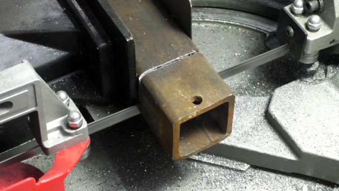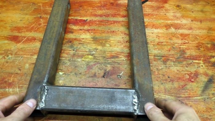 Теперь нужно сварить из заготовок скобу. Центральную трубу 50х50 мм требуется разместить между боковыми трубками и слегка ее развернуть относительно их плоскости. Также понадобится подготовить отрезок трубы 40х40 длиной 150 мм.