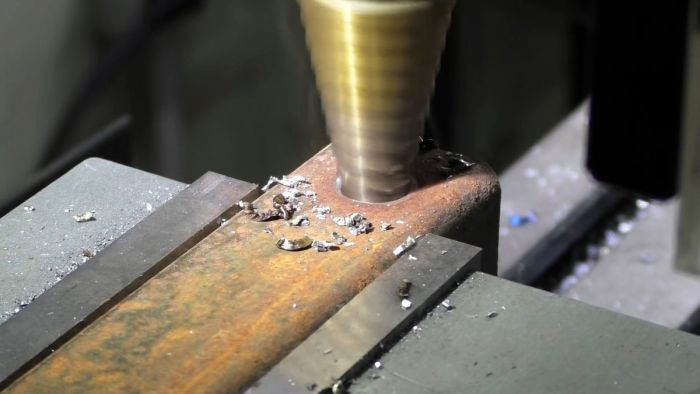 Далее заготавливается 2 отрезка трубы 40х40 мм по 350 мм. С одного края полученных заготовка просверливается сквозное отверстие 18-20 мм под шпильку или прут.