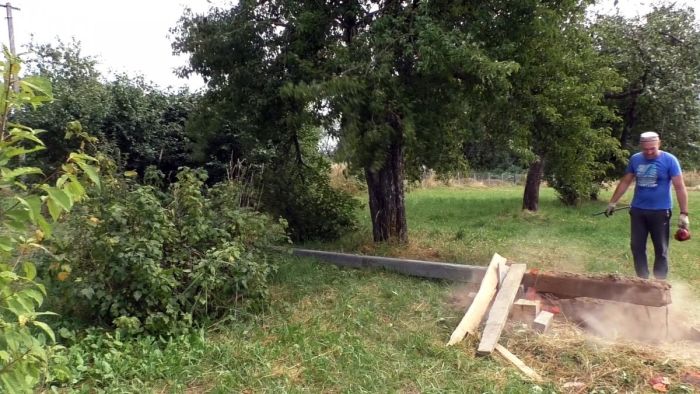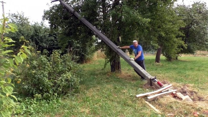 Когда столб выйдет из грунта достаточно, он опрокинется и упадет точно в противоположную от домкрата сторону. Важно, чтобы в это время никого не было в зоне падения. Вырванный в результате столб в дальнейшем пригодиться как бордюр, также его можно разрезать на несколько перемычек для оконных и дверных проемов при строительстве.