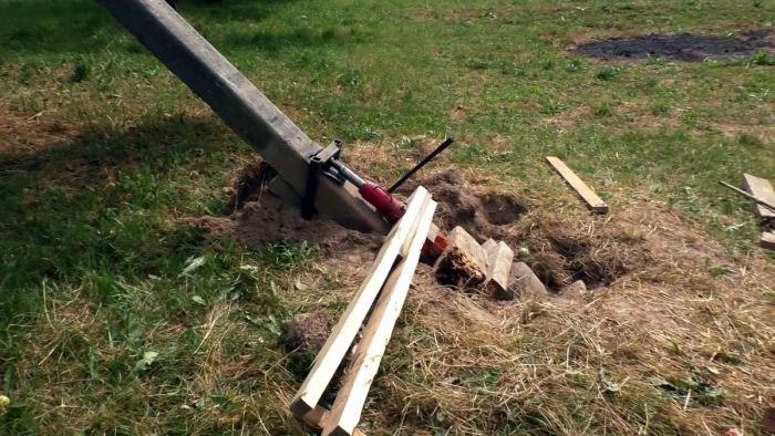 Как только домкрат подымится полностью, нужно его опустить, сдвинуть скобу вниз и снова поднять вместе со столбом. По мере выхода столб начнет крениться, запрокидывая и домкрат. Тогда придется немного повозиться, подставляя дополнительные бруски. При поддомкрачивании необходимо стоять сбоку относительно направления уклона.