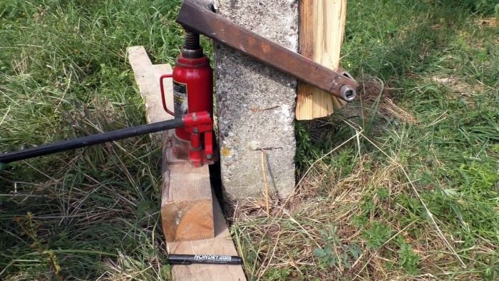 Со стороны шпильки между приспособлением и столбом вставляется деревянный брус. Под толстую трубу подставляется домкрат, установленный на доски. Чтобы видеть прогресс вытягивания столба, следует поставить на нем метку, после этого можно начать его поддомкрачивать.