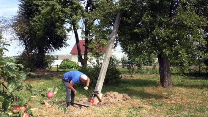 В основном проблема решается арендой крана, но если заезд к столбам отсутствует, тогда можно их вырвать вручную, используя домкрат и самодельное приспособление из труб.