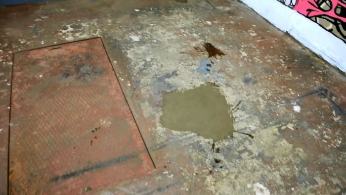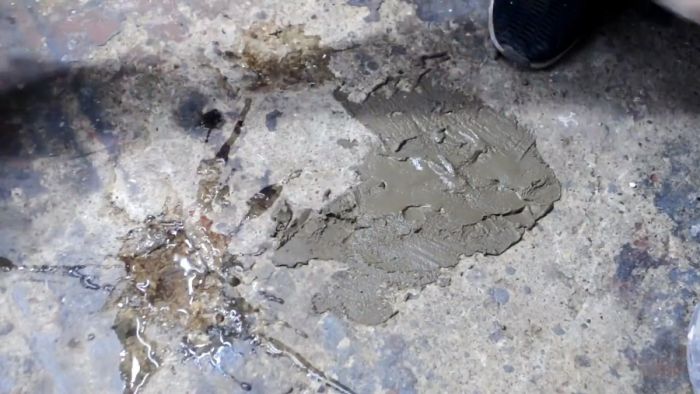 На следующем этапе необходимо заделать рытвины и сколы. Для этого замешивается цементно-песчаный раствор. Так как его нужно немного, то можно просто купить готовую ЦПС в мешке и не возиться с пропорциями. Смесь затворяется водой и заливается на проблемные участки пола. В местах заливки старый бетон нужно хорошо увлажнить, чтобы старая стяжка не вытянула всю влагу из цемента, пока тот схватывается. Если в наличии имеются остатки наливного пола, можно использовать их, будет даже лучше и быстрее. Раствор разравнивается кельмой и оставляется на несколько дней для схватывания.
