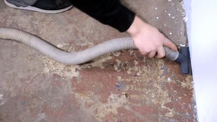 Первым делом нужно подмести пол. Важно убрать всю отслоившуюся крошку. На нем не должно остаться болтающихся и высыпающихся частиц. После этого поверхность необходимо пропылесосить. Чтобы не убить этим пылесос, желательно подключить его через циклон или предфильтр. Чел лучше подготовить поверхность, тем надежней будет держаться краска.