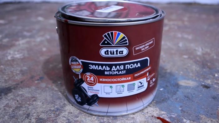 Эмаль лучше наносить кистью с дальнего конца пола в направлении до выхода. Хотя это и дольше, чем валиком, но с ней расход будет меньшим. На старом бетоне много мелких рытвин. Если пользоваться валиком, то при закрашивании придется его часто макать в эмаль, чтобы она в них затекала. При использовании же кисти углубления получится замазать, а не заливать, что снизит расход.