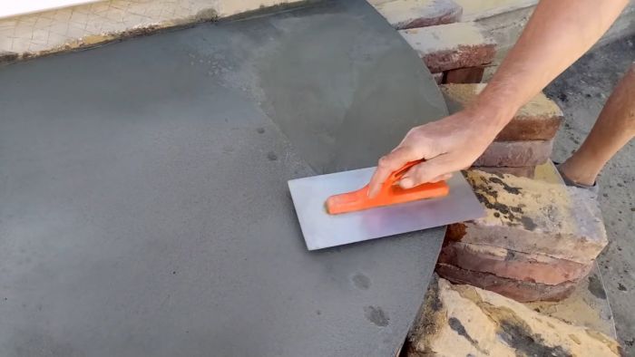 Железнение выполняется на схватывающемся, еще не высохшем бетоне. Идеально начать, когда из него перестанут выходить пузырьки воздуха и выступит цементное молочко. В зависимости от пропорций применяемого бетона и его консистенции, подходящий момент настанет через 20-40 минут после завершения его разглаживания.