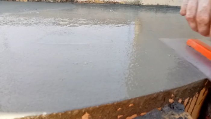 Сверху схватывающаяся стяжка через сито посыпается цементом. Нужно равномерно припорошить поверхность. Затем необходимо пригладить стяжку смоченной гладилкой или кельмой. Если выступило мало цементного молочка, то следует понемногу приливать воду.