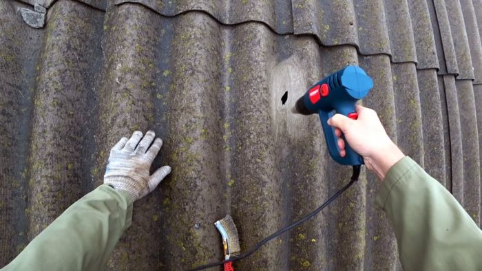 Если шифер мокрый, то его обязательно следует просушить по зачищенному месту, пока он не посветлеет.
