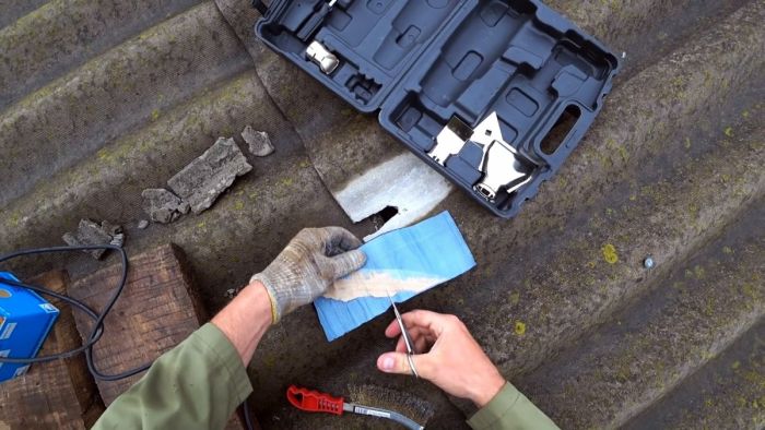 Первым делом нужно проложить удлинитель к месту ремонта, чтобы подключить монтажный фен. Важно передвигаться по шиферу с предельной аккуратностью, чтобы его не расколоть, так как трещины через весь лист лентой не отремонтируешь. Лучше всего положить на крышу доску, и передвигаться по ней. Важно не наступать на края и особенно углы листов, так как в этом месте они очень хрупкие.