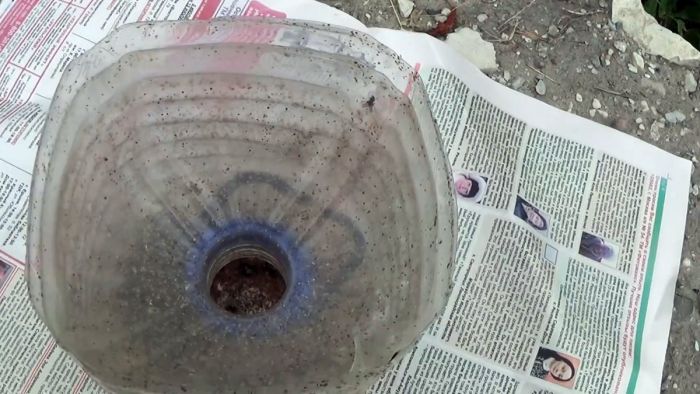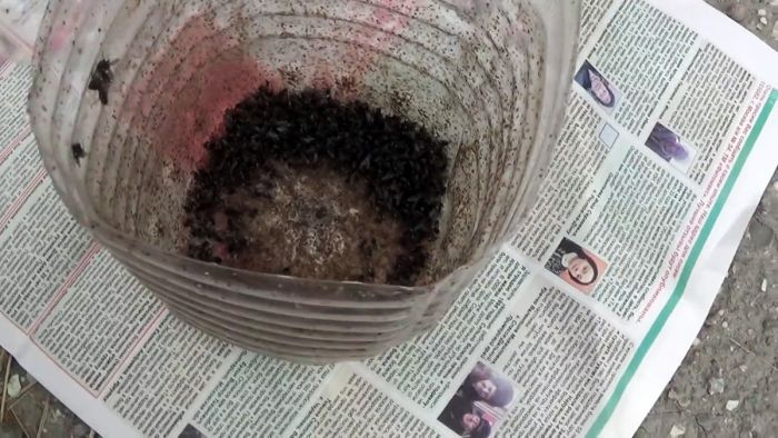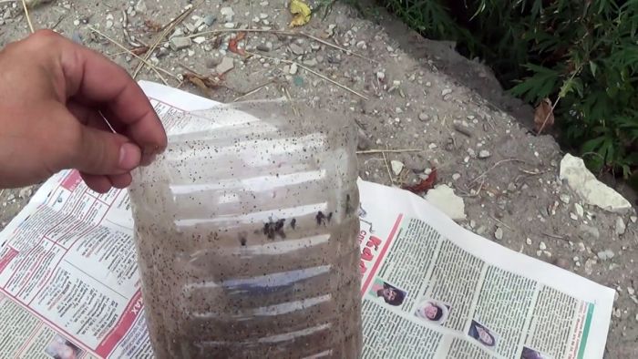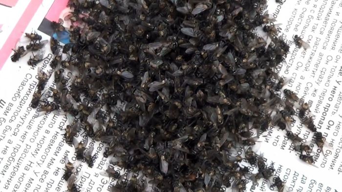 Делается сразу 3-4 таких ловушек, и расставляются по периметру помещения. Залетающие на приманку мухи не смогут выбраться обратно, поэтому так и останутся внутри. За неделю ловушкой из бутыли можно выловить пару сотен мух, которые без еды и воды благополучно погибают. Собранные насекомые можно выбросить или скормить птицам.