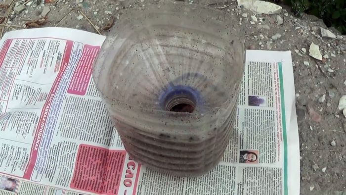 От ПЭТ бутылки, а лучше от бутыли отрезается горловина ближе к центру. Затем она переворачивается и вставляется заливным отверстием без крышки вниз к донышку. Горловина должна не доходить до дна пару сантиметров. После этого в ловушку заливается несколько миллилитров сладкого сока, варенье, мед или сахар.