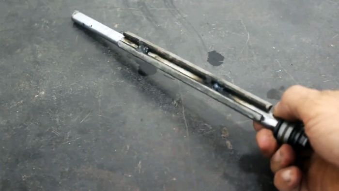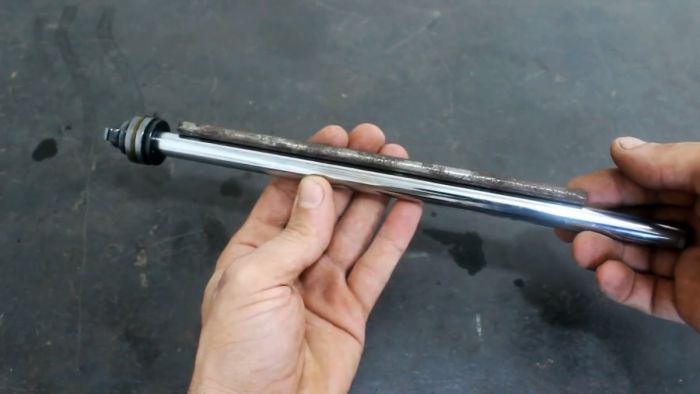 К штоку приваривается 2 отрезка прута со смещением под одну сторону. Сплошной шов не нужен, достаточно их прихватить в паре мест. Затем необходимо поместить шток обратно во внутреннюю колбу. Если приваренные пруты мешают, их нужно подточить.
