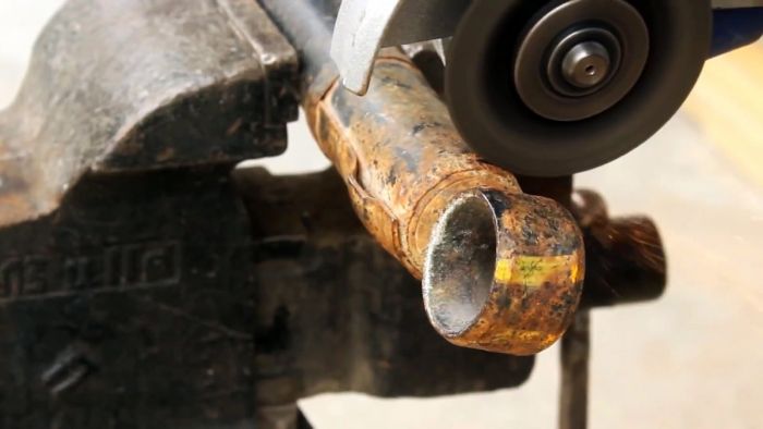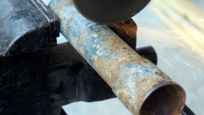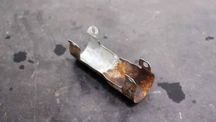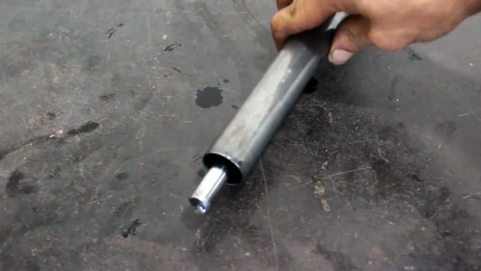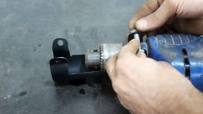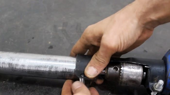 Вибратор уже практически готов, остается сделать для него переходник под дрель. Для этого используется штатный кожух от амортизатора. От него отрезается кусок 200-250 мм. По краям заготовки сверлится по 2 отверстия под проушины хомутов. Далее с помощью болгарки вырезается переходник как на фото.