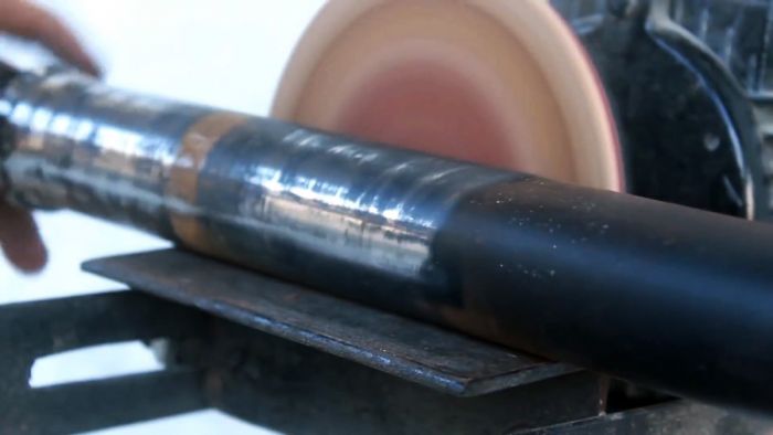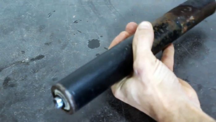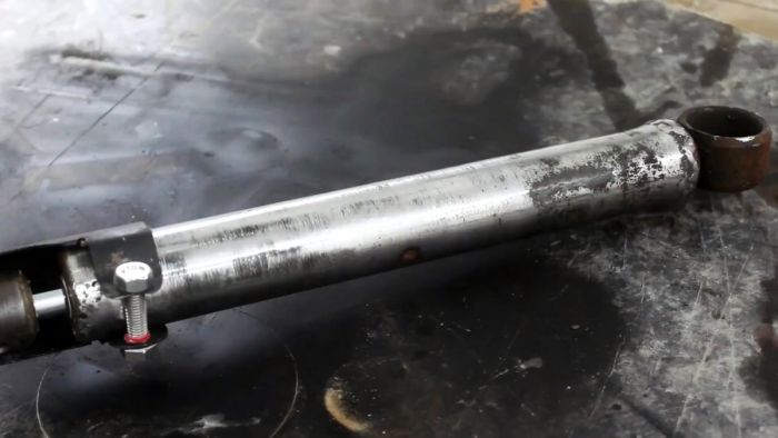 Доработанный шток с внутренней колбой вставляются в корпус амортизатора и спиленная проушина с крышкой привариваются обратно. Далее корпус амортизатора зачищается, чтобы его можно было покрасить, и в дальнейшем с него легче смывался бетон после использования.