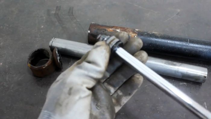 Из амортизатора снимается защитный кожух и срезается проушина строго по кругу, чтобы не повредить внутреннюю колбу. Затем вынимается шток.
