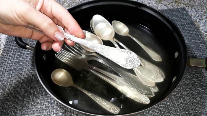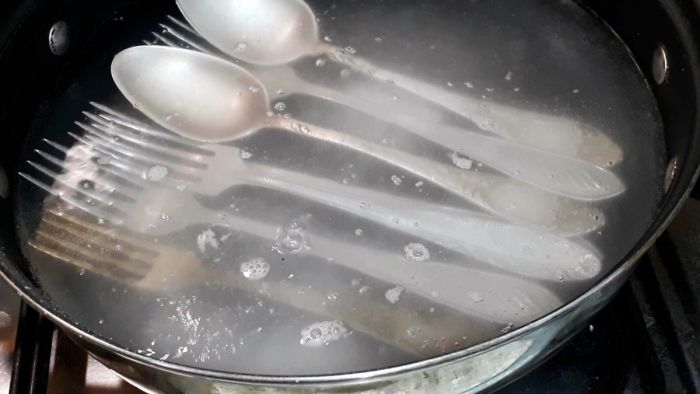 Кастрюля устанавливается на огонь, и приборы варятся 20-25 минут. До кипения можно не доводить. Затем огонь выключается. После остывания воды ложки и вилки протираются.