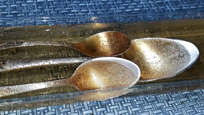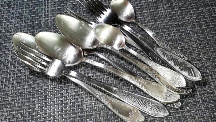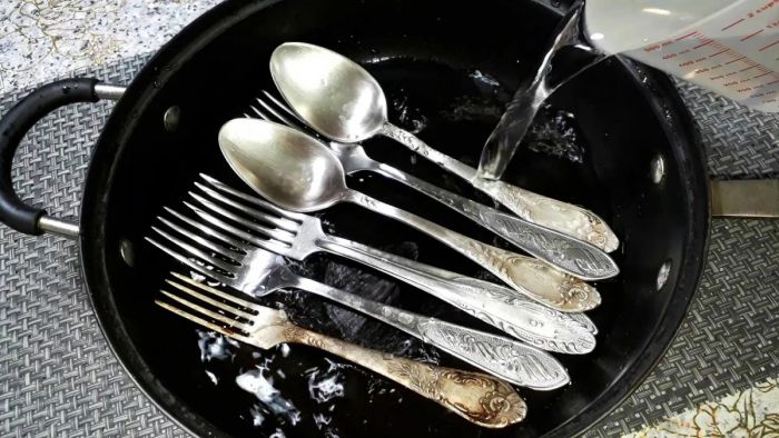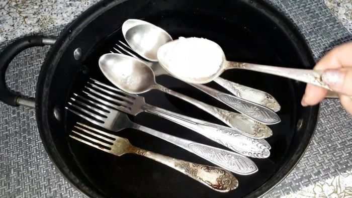 Убрать коричневый налет и несмываемую грязь на ручках столовых приборов крайне сложно. Обычное моющее средство в этом плане бесполезно. Вернуть чистоту и сияние вилкам и ложкам можно кипячением в растворе соды с солью.