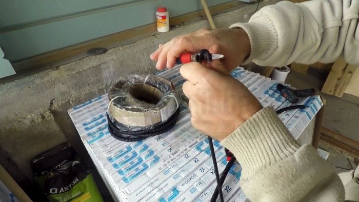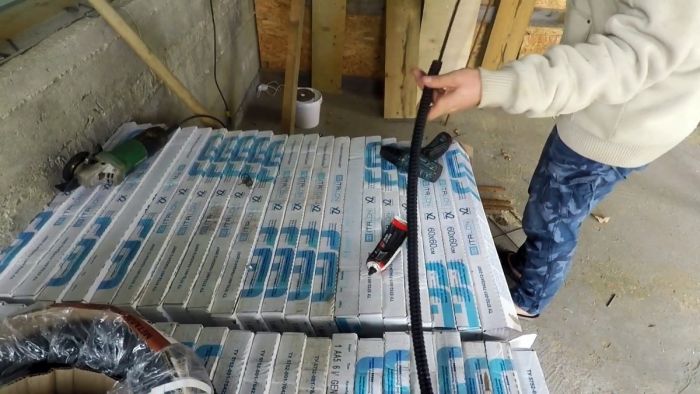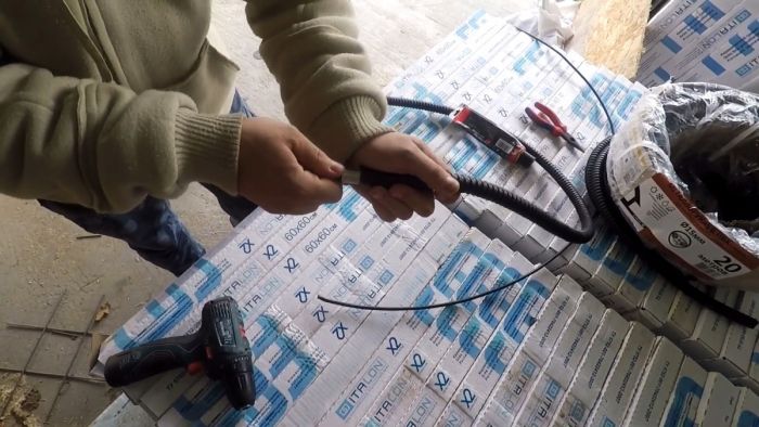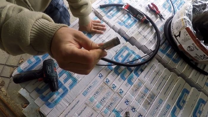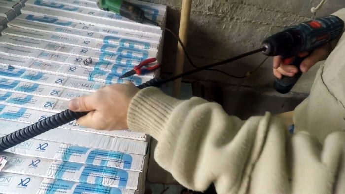 При работе вибратором необходимо его придерживать одной рукой за гофру. Вращающийся при этом внутри провод бьет хвостиком по коронке, за счет чего создается сильная вибрация. Инструмент делается буквально за 5 минут, к тому же если после ремонта остались обрезки проводов и гофрированной трубы, то его изготовление вообще обойдется бесплатно. Самоделка работает, причем хорошо, поэтому идею стоит запомнить, когда-нибудь пригодится.