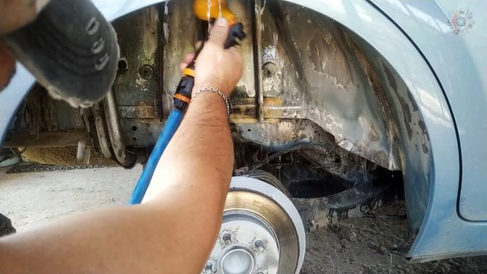 Поверхности, которые необходимо обработать антикором, зачищаются в местах возникновения коррозии до чистого металла.