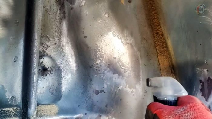 Желательно удалить полностью всю ржавчину, поэтому куда невозможно дотянуться электроинструментом в ход идет отвертка или ручная щетка по металлу. Защищенные места необходимо обработать преобразователем ржавчины. Его удобно наносить распылителем.