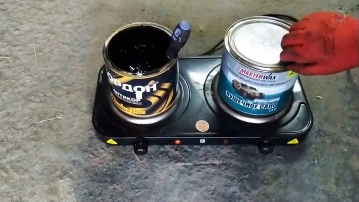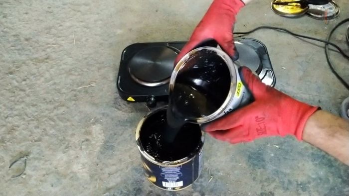 На плитке разогревается пушечное сало и битумно-полимерная мастика до нормальной текучести, затем они перемешиваются один к одному. Смесь нужно продолжить греть, пока она не получит консистенцию воды.