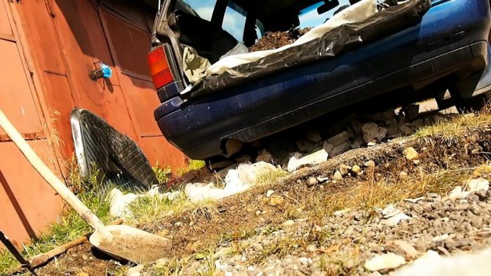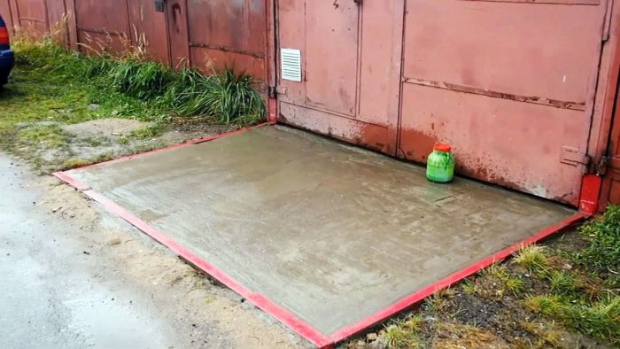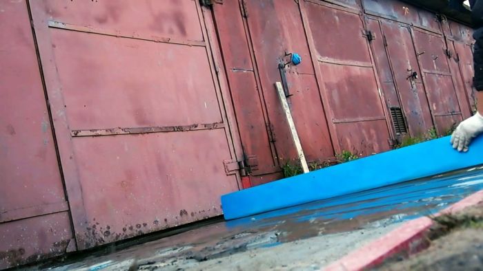 Осадки, дренажные и грунтовые воды, пробуксовка колес постепенно понижают уровень грунта перед гаражом и создается заметный перепад с отметкой пола. Затрудняется въезд и выезд, особенно когда поперек лежит уголок или швеллер – элемент силового каркаса металлического гаража. Приходиться подкладывать камни, доски, всякий мусор. Опасно и некрасиво. Но все можно поправить, причем почти без затрат денег.