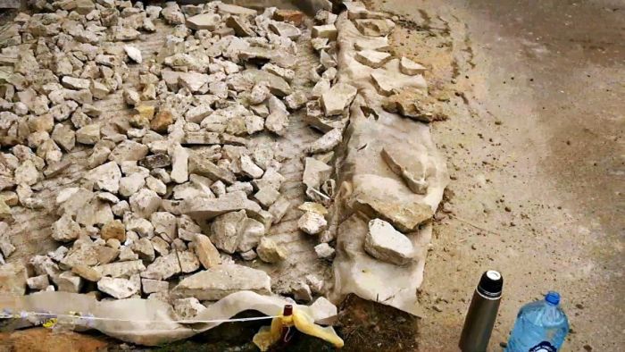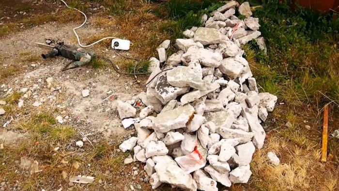 Определив размеры основания въезда, отмечаем их шнурами. Перфоратором разрыхляем грунт и удаляем его. Если встретятся камни и обломки бетонного мусора, то убираем их в сторону. Они еще пригодятся.