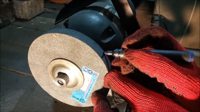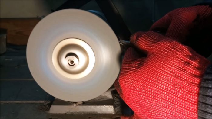 Чтобы все углы сохранились, и правка удалась, нужно прикладывать режущую кромку к абразивному диску строго параллельно оси вращения наждака.
