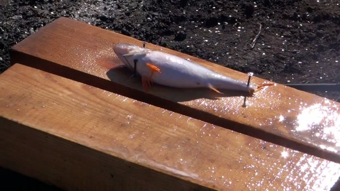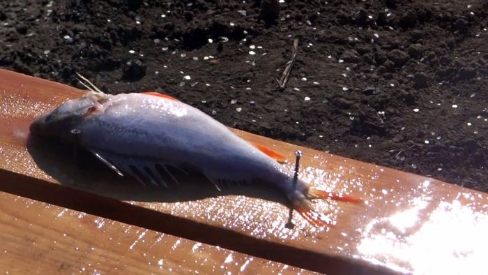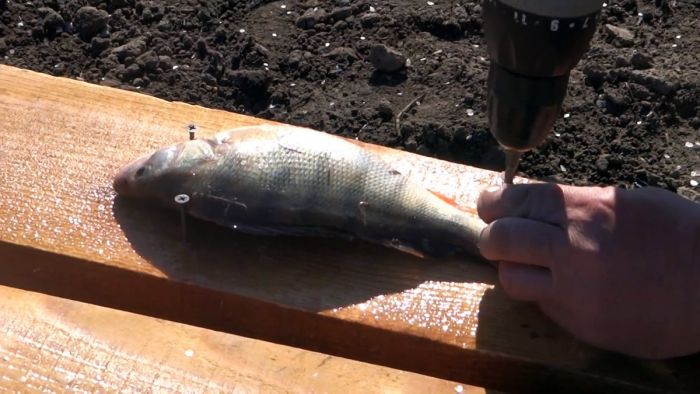 Брусок или доска должны быть надежно закреплены, чтобы напором воды ничего не перевернулось. Кладем рыбу, а по бокам головы прибиваем гвозди или заворачиваем саморезы. Эти элементы нужны для надежной фиксации. А в прямо в хвост вворачиваем третий саморез.