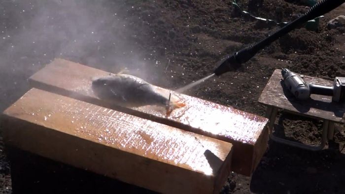 Вы наловили много рыбы и хотите все быстро почистить, да чтобы чешуя не летела в разные стороны? Есть очень любопытный способ. Идея конечно не новая, в интернете уже много подобных методов, поэтому решили повторить увиденное и почистить рыбу быстро при помощи минимойки высокого давления.