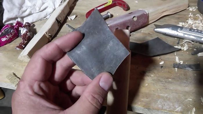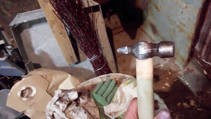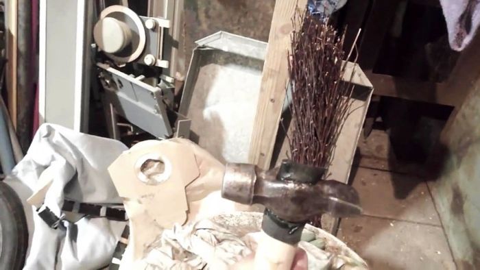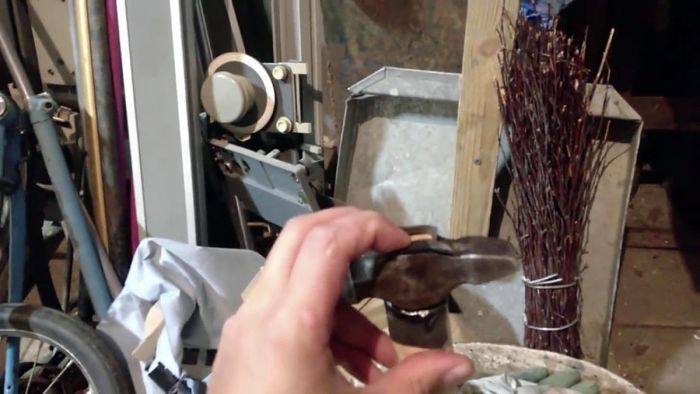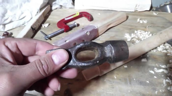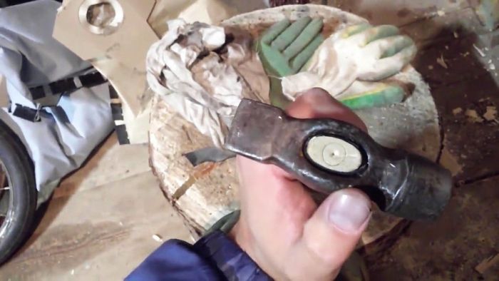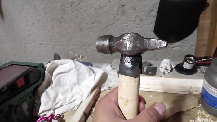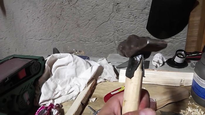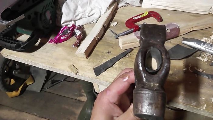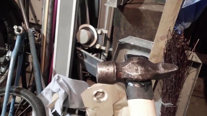 Также вместо резины можно использовать трубку из оцинкованной жести с фальцевым швом, которая надевается на рукоять, и вставляется в отверстие молотка. Далее, как обычно: несколько ударов и все части занимают свои места, причем очень прочно и надежно.